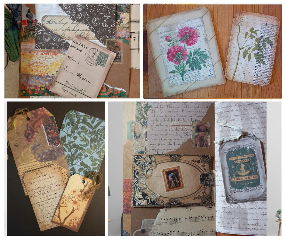 I am devoted to utilizing paper and lightweight cardboard materials that might otherwise be tossed into the bin. Creating mixed media and junk journaling supplies allows my love of up-cycling and art to merge.There are numerous forms of mixed media paper arts. However, the general definition of a junk journal states: A book that is hand bound using up-cycled materials. Old music sheets, book pages, junk mail, and packaging material can easily form page bases. Old ephemera such as stamps, postcards, and ticket stubs make excellent accent pieces. Paints, gesso, inks, and fabrics can add a whimsical mixed media element to these creations.Interested? I teach in person classes, perfect for small festivals, parties, and friends night in. These classes are geared toward beginner and intermediate paper artists. Please feel free to contact me for further information.